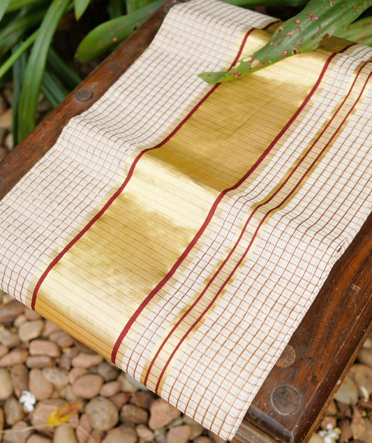 Pure Cotton Kerala Kasavu Check Design Saree With Maroon Border